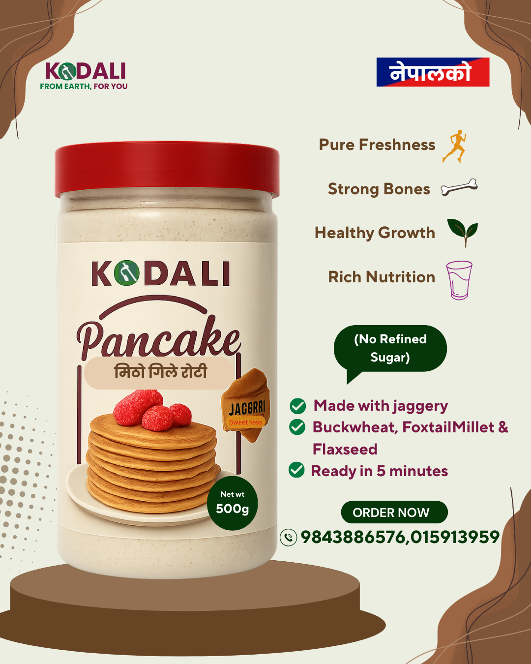 Kodali Pancake Mix –is a nutrient-packed, naturally sweet pancake flour made from: Sprouted foxtail millet, Sprouted barley, Sprouted buckwheat, Flax seeds, Jaggery and Milk powder.This mix combines ancient grains and seeds in a modern, easy-to-cook format, making it ideal for quick breakfasts or snacks that don’t compromise on nutrition or taste. It’s naturally sweetened with jaggery and contains no ultra process flour, white sugar, preservatives, or artificial flavors
